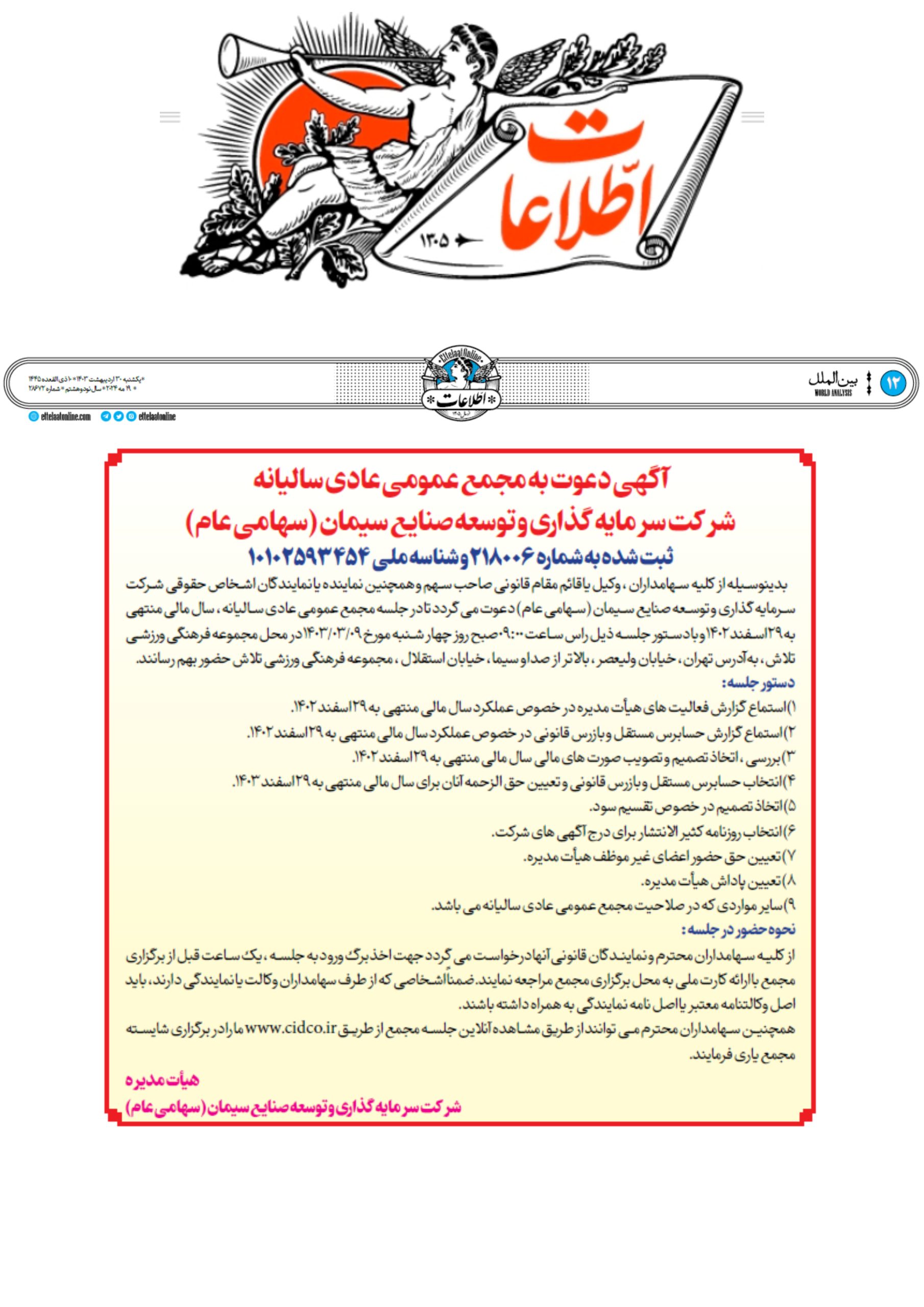 پخش زنده مجمع عمومی سالیانه منتهی به سال مالی 1402/12/29 برای مشاهده برروی لینک زیر کلیک نمایید: پخش آنلاین نام کاربری جهت مشاهده ،کدملی سهام دار می باشد. رمز عبور… متن کامل خبر » می 27, 2024 15:04-