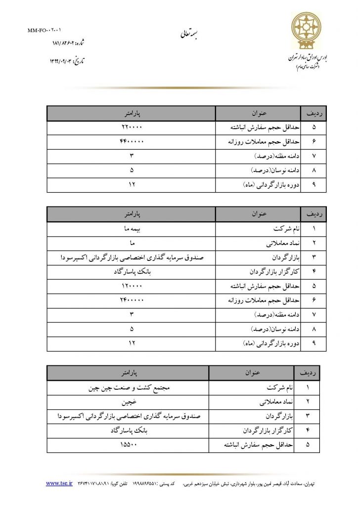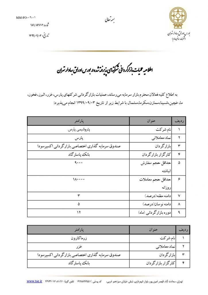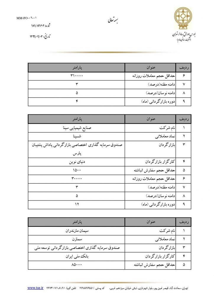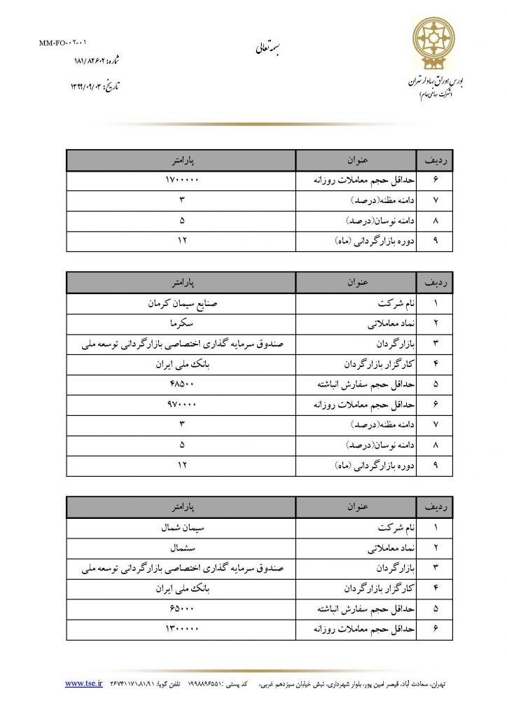 هلدینگ سرمایه گذاری و توسعه صنایع سیمان در راستای ثبات بازار سرمایه و صیانت از حقوق سهامداران در شرکت های زیر مجموعه فرعی خود اقدام به انعقاد قرارداد بازارگردانی با صندوق سرمایه گذاری اختصاصی بازارگردانی توسعه ملی نمود. بر این اساس مطابق با اطلاعیه شماره 181/82602 مورخ 1399/09/03 مدیریت عملیات بازار شرکت بورس اوراق بهادار تهران، عملیات بازارگردانی در نمادهای سکرما، سشمال و سمازن از تاریخ 1399/09/03 مطابق با پارامترهای اعلامی پیوست انجام می پذیرد.